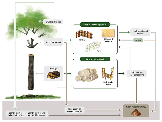 Figure 1. The Wood Product Carbon Pool. An example of the multiple products that can be harvested from forests, ranging from high value products and ranging in value are small roundwood products. Residues from wood processing can be recycled into other wood products, and often the residues can be used to generate energy. Harvesting residues can also be used for energy but often they are left on site.