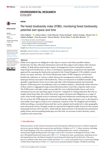 Bellamy, C., Rattey, A., Edwards, C., Kortland, K., Stringer, A., Tew, E., … & Broome, A. (2024). The forest biodiversity index (FOBI): monitoring forest biodiversity potential over space and time. Environmental Research: Ecology, 3(3), 035001. https://iopscience.iop.org/article/10.1088/2752-664X/ad57cf